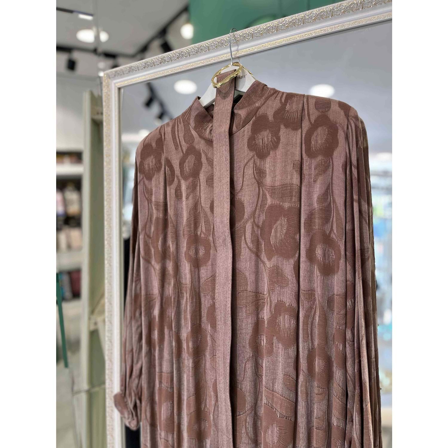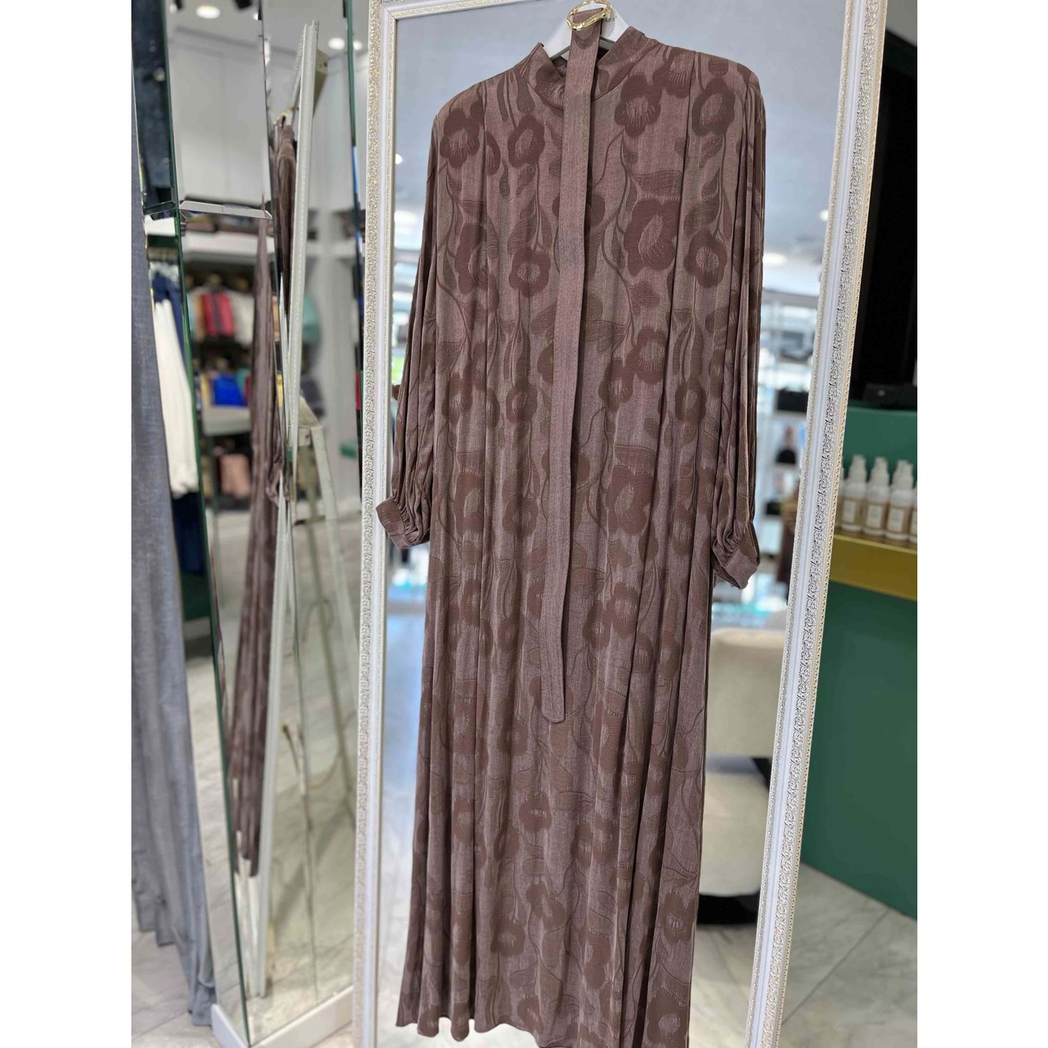 PUANE İPEK CUPRA GÜL DESENLİ ELBİSE - KAHVERENGİ - S