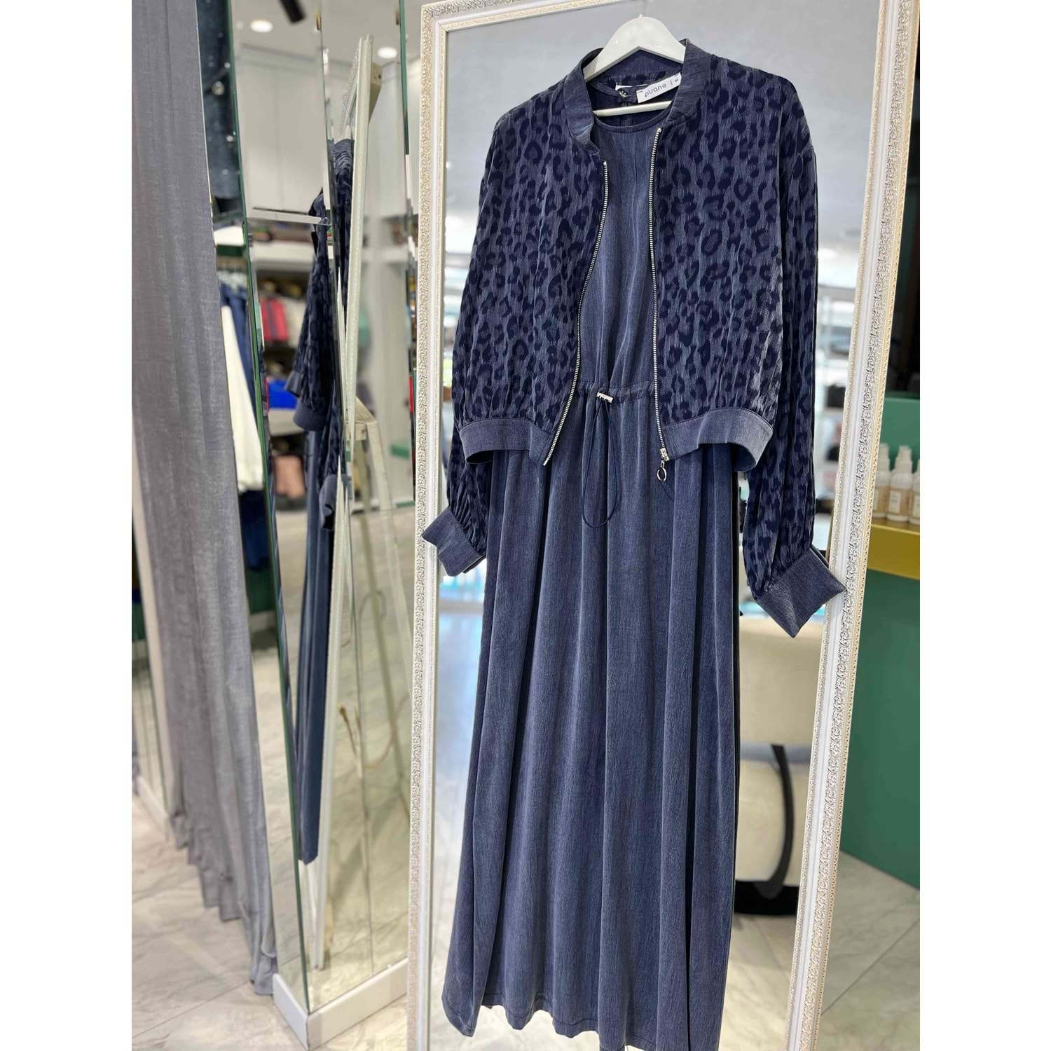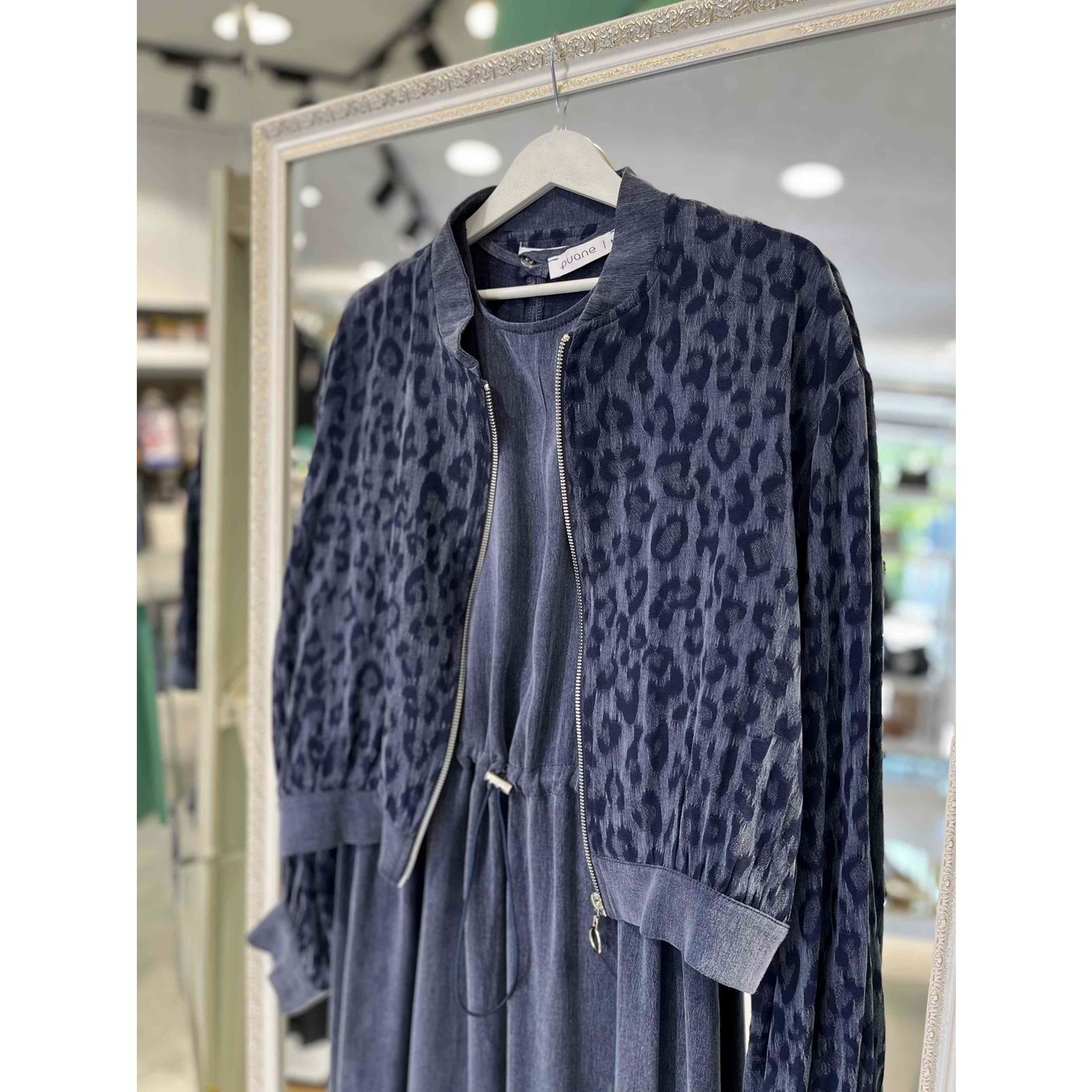 PUANE LEOPAR DESENLİ İPEK CUPRA ELBİSE 12612 - LACİVERT - L